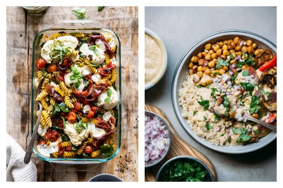 At top: Caprese Pesto Pasta Bake at Halfbaked Harvest; Moroccan Spiced Vegetable and Chickpea Bowl at Simple Natural Nutrition